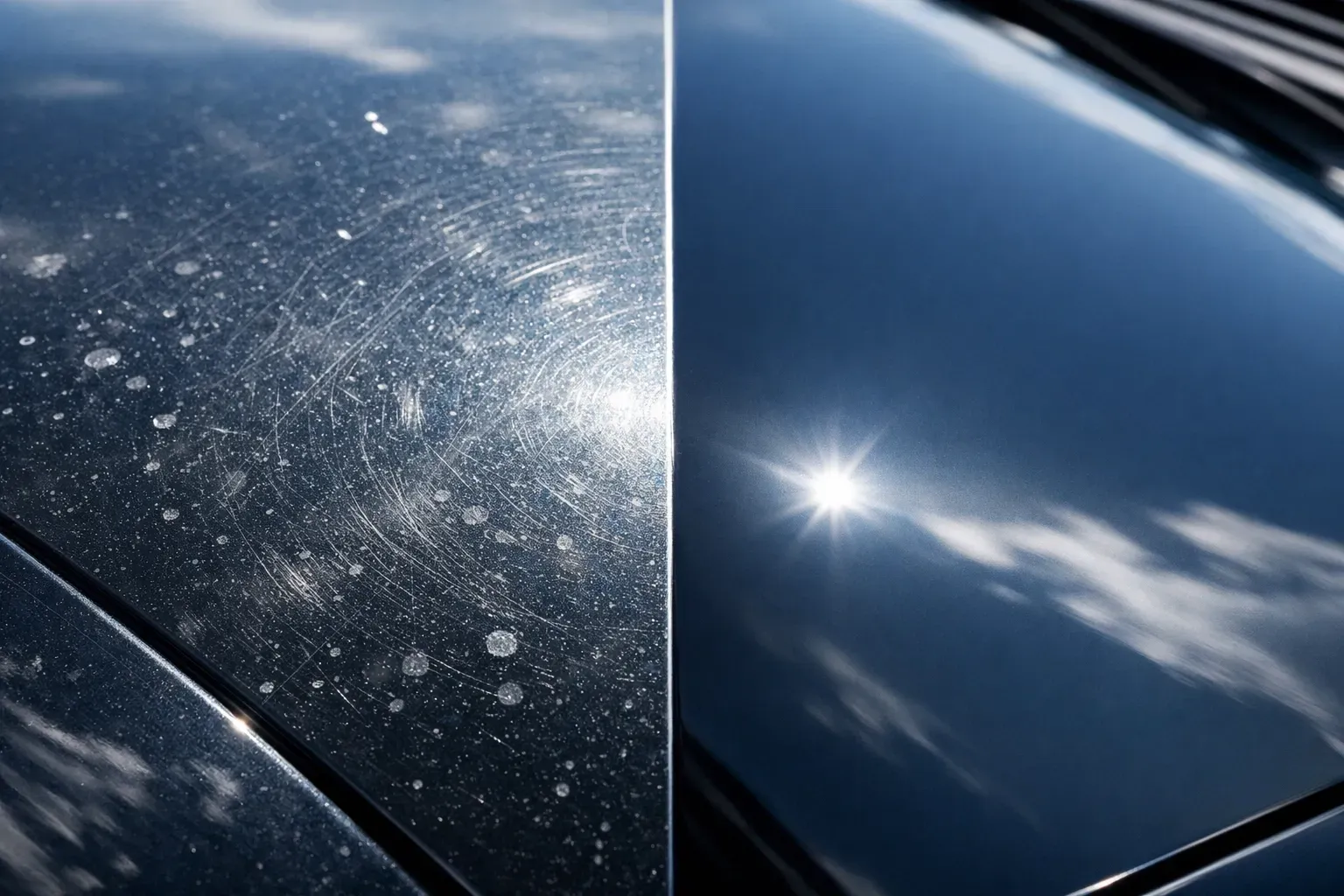 Uncorrected paint shows a spider web of fine scratches when light hits at certain angles. You'll see dull spots where oxidation has taken hold. Water spots leave permanent etching. The overall appearance lacks depth: it's one-dimensional, like looking at a photograph instead of through a window.